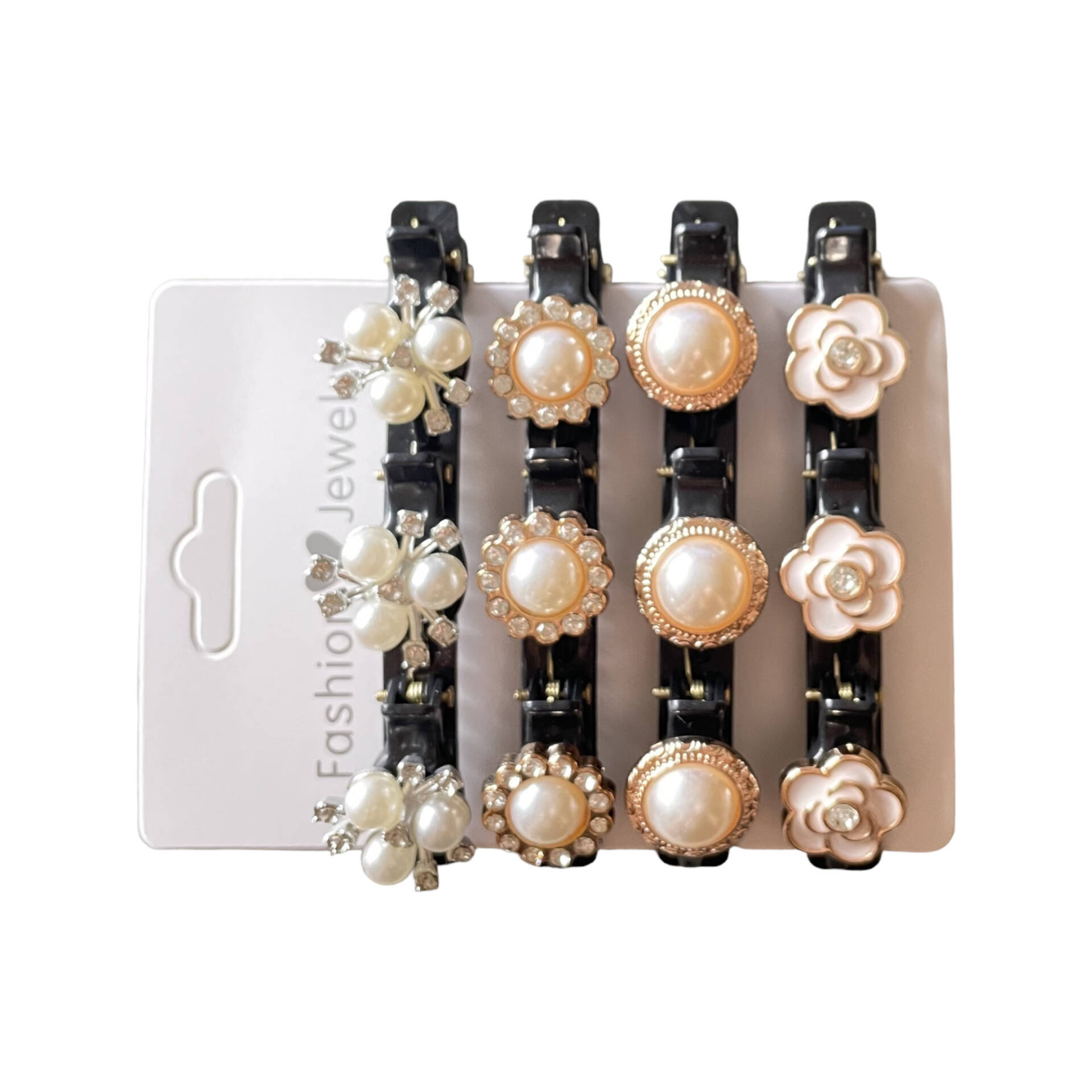- Indulge in the timeless allure of our Elegant White Pearl Hair Clip Set. This exquisite collection features four hair clips, each meticulously crafted to showcase the beauty of white pearls in unique designs. From the enchantment of a single large pearl to the sparkling elegance of a pearl surrounded by rhinestones, the sophistication of a triple pearl cluster, and the delicate charm of a white rose design, this set offers versatile options to adorn your hairstyle with grace.