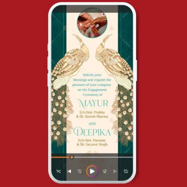 Welcome to an enchanting peacock-themed engagement ceremony invitation! ๐ฆโจ Our invitation features a captivating green background adorned with a mesmerizing peacock, evoking the timeless beauty and charm associated with these majestic birds.