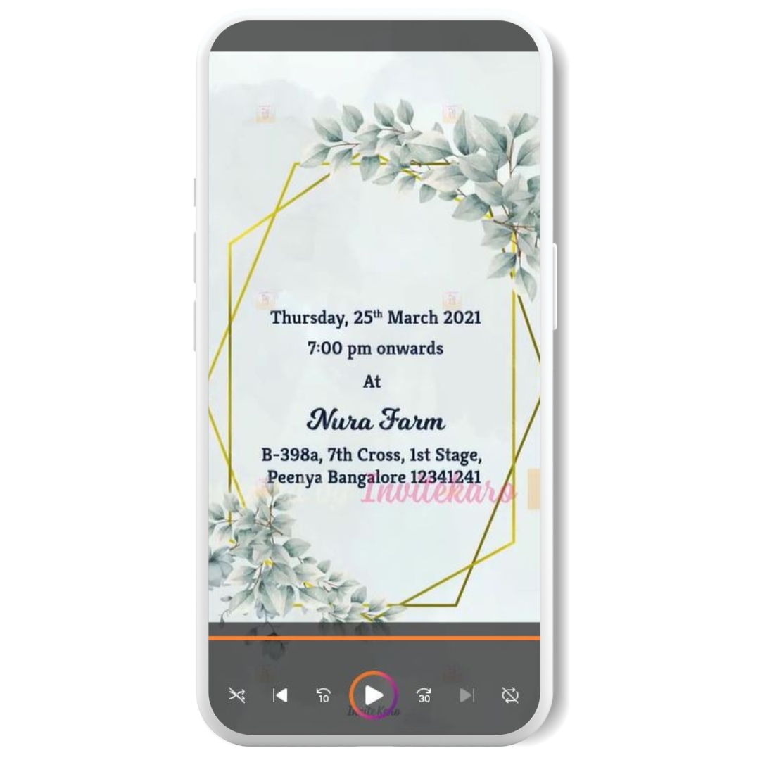 This exquisite E Wedding Card invitation is embraced by an elegant pastel frame, delicately adorned with a captivating floral pattern. The pastel wedding invitation card is thoughtfully designed with a floral theme and boasts a unique self-print feature, complemented by a luxurious gold border on the flap.