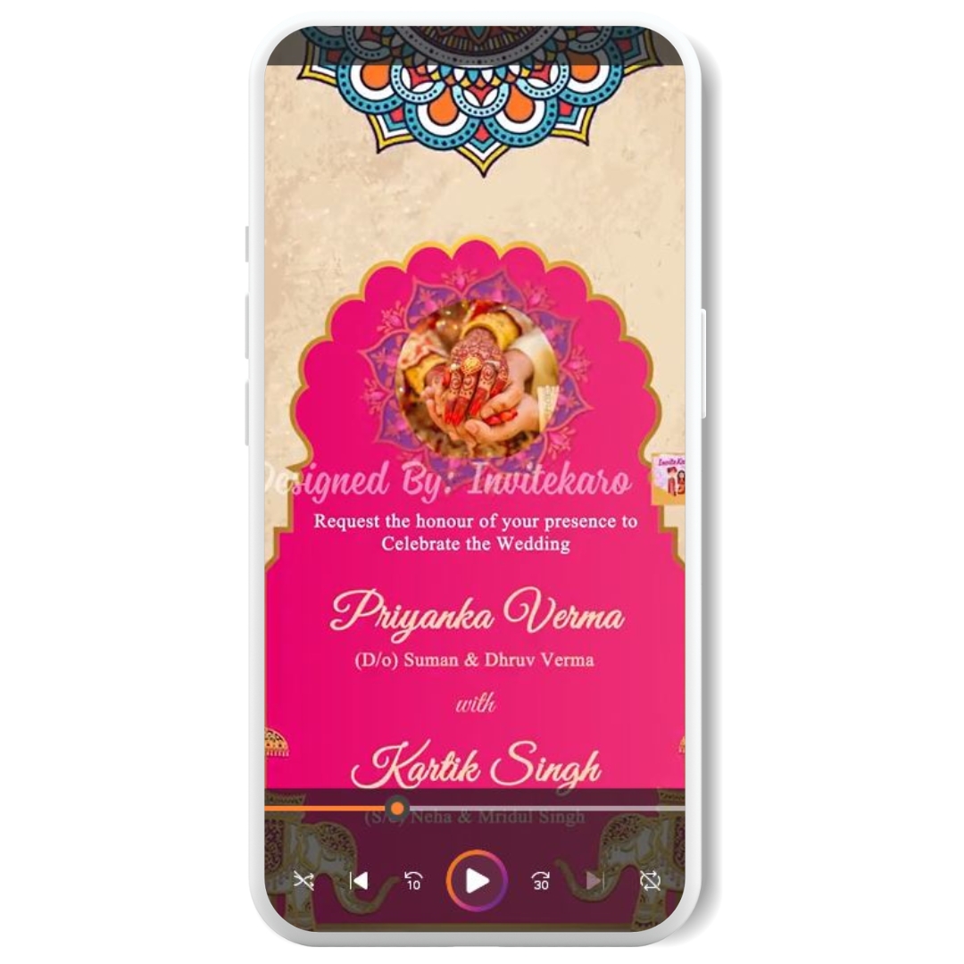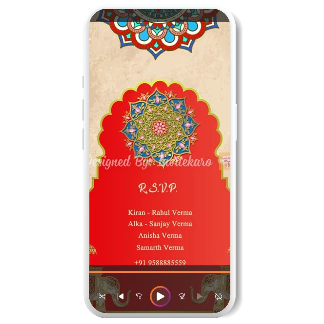 At the heart of this E-invitation lies a mesmerizing mandala, symbolizing unity and beauty. Graceful elephants stand proudly on the sides, adding a touch of regal elegance to the invite. It’s a digital creation that truly resembles the most beautiful traditional invitations, bringing an air of grandeur to your wedding preparations.